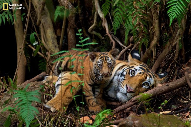 摄影师史蒂夫·温特花了24天时间,试图捕捉这只孟加拉虎母虎的影像。耐心终得回报。这张照片拍摄于班达迦国家公园,画面中的她与两个月大的幼崽在一起。图片来源:Steve Winter / National Geographic