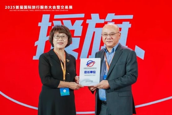 华程国旅集团凭借深耕旅游行业数十载的卓越积淀、引领行业创新的前瞻视野以及推动产业发展的突出贡献,荣膺中国旅行社协会批发商分会会长单位。集团总裁何勇当选中国旅行社协会批发商分会首任会长。中国旅行社协会副会长兼秘书长孙桂珍向华程国旅集团总裁授会旗和会长单位牌。这不仅是行业对华程国旅集团作为头部旅行社集团综合实力的高度认可,更是华程多年来深耕旅游领域、引领产业转型升级的生动注脚。