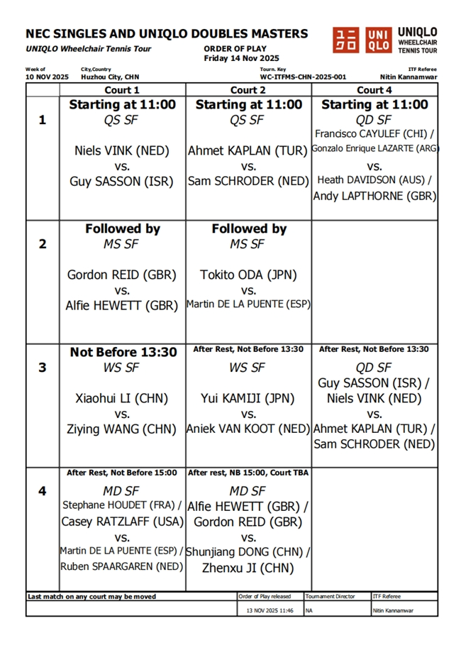 11月14日,各组别半决赛相继打响,争夺决赛席位。男单半决赛,小田凯人迎战马丁・德拉普恩特,戈登・里德与阿尔菲·休伊特隔网相对。女单方面,李晓辉与王紫莹这对双打搭档在赛场上相遇,争夺一个决赛名额。另一场女单半决赛,头号种子上地结衣面对范库特的挑战。四肢组半决赛,尼尔斯・温克对阵盖伊・萨松,艾哈迈德・卡普兰则与萨姆・施罗德争夺决赛权。