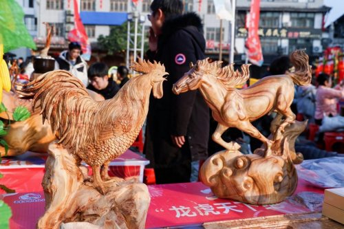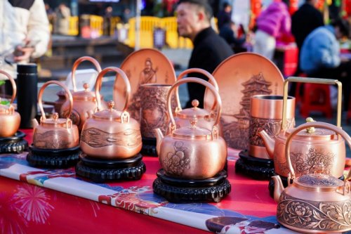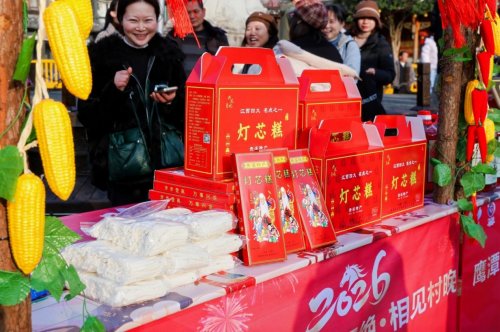 戏台周边,由“村晚”带动的“年集”率先点燃鹰潭新春的火热氛围,有戏有味、年味十足。舞龙、舞狮在市集与舞台区间流动巡演,与游客亲密互动,欢笑声此起彼伏;多家省、国家级合作社与企业携匠心好物亮相,贵溪錾铜雕刻的细腻精巧、余江木雕的古韵匠心、道香养生香的清雅怡人,引得村民与游客纷纷驻足细赏;天师板栗、上清豆腐、捺菜等地道美食香气四溢,打糍粑、制作灯芯糕等民俗体验让游客零距离感受传统手艺的魅力;新春赶集摊位上,春联福字、本土农特产与龙虎山主题文创琳琅满目,更有“巡游送福”等互动环节,为市民游客打造集观赏、品尝、购物、参与于一体的沉浸式新春盛会。