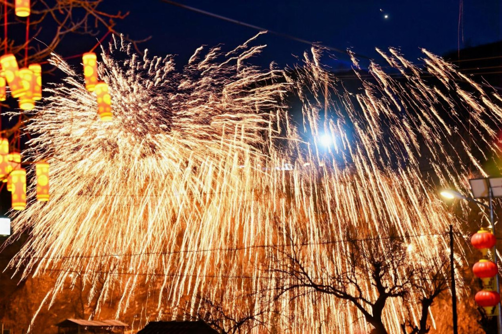 龙交乡王家沟村以非遗打铁花为核心亮点,近1600摄氏度的铁水被奋力击向夜空,化作万朵金花、流光溢彩,被誉为最古老的 “烟花”,惊艳八方游客;裴沟乡永由村则坚守民俗本真,推出古老转院送福、闹秧歌、伞头对唱等特色活动,上演掐草帽、打酸枣、搬水船等原生态民俗表演,让古老民俗在新时代得以薪火相传,留住乡愁根脉。